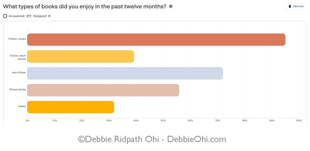 Thanks to all who took my (very) informal reading poll at the beginning of the year. 217 responded. Keep in mind that I am not a professional survey-maker, and my reach was limited to my own social media…so be wary about drawing broad conclusions. After the first few hours, I also added freeform comment boxes at the end of each major section, as some of you suggested. Because of this, however, I ended up with a TON of freeform comments. 😁 I lack time to organize or summarize these, but have included a sampling in this post, for others interested in browsing.