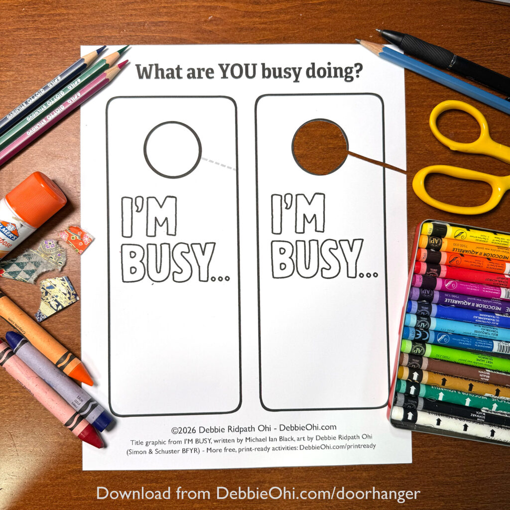 Educators, feel free to use this as a classroom activity with young readers! Also check out the companion Classroom Guide For I’M BUSY for more ideas. I’d love to see your students’ custom door hangers!