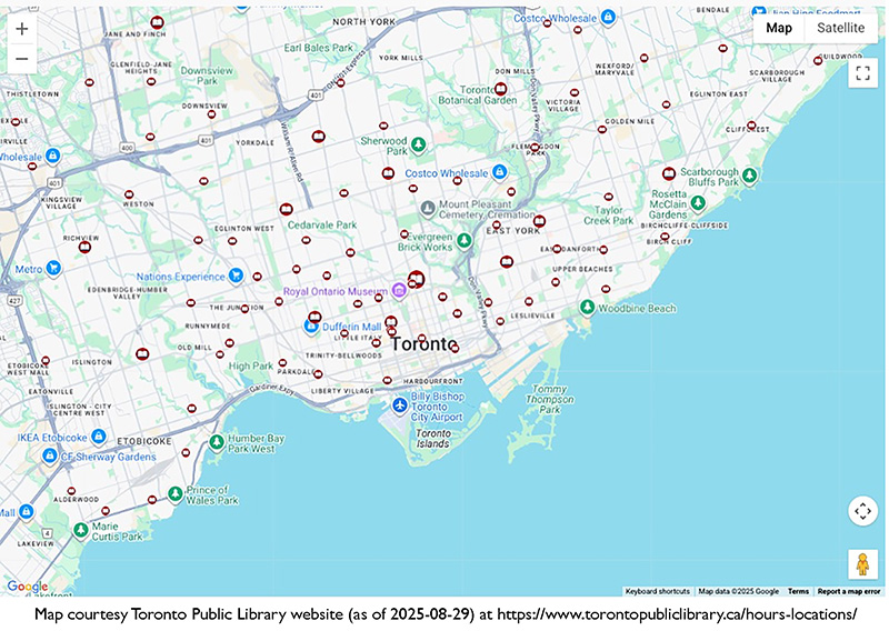 For now, here’s a screenshot I took of the Toronto Public Library Hours & Locations map.
