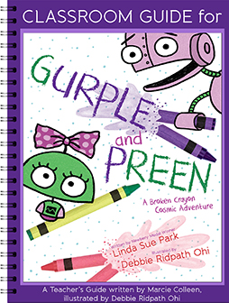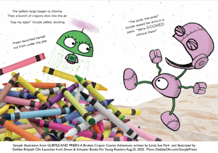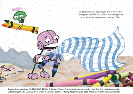 “The last page brings us down to earth, as the ‘commander’ is revealed to be a little girl in her bedroom, surrounded by robot toys, crayons, and space-and-science paraphernalia-gazing out her bedroom window at the night sky. In the category of they-were-toys-all-along picture books, this one stands out, as the child’s imagined scenarios-and Park’s and Ohi’s storytelling-are particularly creative and freewheeling. The dialogue, especially Gurple’s interjections (“Zap my apps!” “Bits and bytes!”), is bright and witty, as are the digital crayon-box illustrations with lots of dimension and plenty to look at-and starring an endearing android odd-couple pair.” – The Horn Book